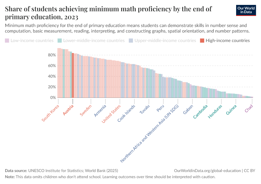 “Data Page: Share of students achieving minimum math proficiency by the end of primary education”. Our World in Data (2026). Data adapted from UNESCO Institute for Statistics. Retrieved from https://archive.ourworldindata.org/20260130-180113/grapher/share-of-students-at-end-of-primary-education-achieving-minimum-math-proficiency.html [online resource] (archived on January 30, 2026).How to cite this data