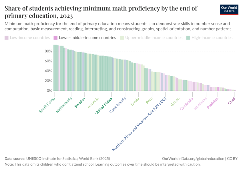 UNESCO Institute for Statistics – processed by Our World in Data. “Share of students achieving minimum math proficiency by the end of primary education” [dataset]. UNESCO Institute for Statistics, “Data from multiple sources” [original data]. Retrieved March 7, 2026 from https://archive.ourworldindata.org/20260304-094028/grapher/share-of-students-at-end-of-primary-education-achieving-minimum-math-proficiency.html (archived on March 4, 2026).
