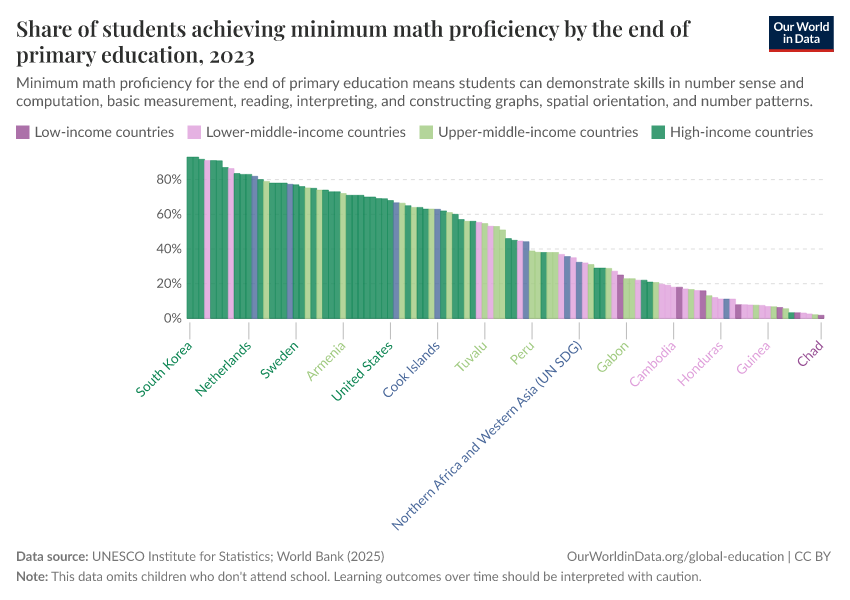 UNESCO Institute for Statistics – processed by Our World in Data. “Share of students achieving minimum math proficiency by the end of primary education” [dataset]. UNESCO Institute for Statistics, “Data from multiple sources” [original data]. Retrieved April 9, 2026 from https://archive.ourworldindata.org/20260304-094028/grapher/share-of-students-at-end-of-primary-education-achieving-minimum-math-proficiency.html (archived on March 4, 2026).Download