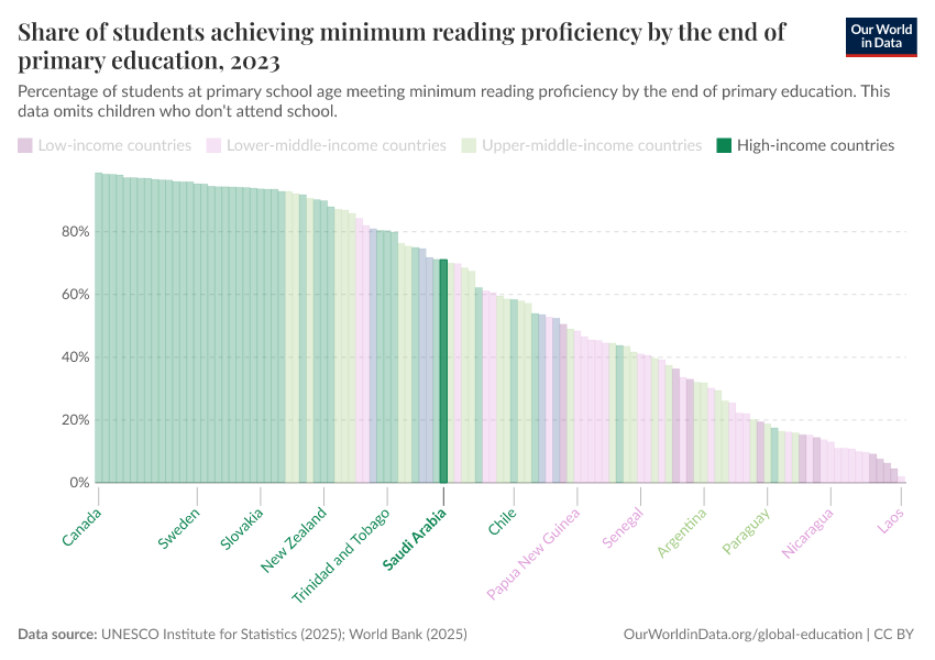 “Data Page: Share of students achieving minimum reading proficiency by the end of primary education”, part of the following publication: Hannah Ritchie, Veronika Samborska, Esteban Ortiz-Ospina, and Max Roser (2023) - “Global Education”. Data adapted from UNESCO Institute for Statistics. Retrieved from https://archive.ourworldindata.org/20260122-091445/grapher/share-of-students-at-end-of-primary-education-achieving-minimum-reading-proficiency.html [online resource] (archived on January 22, 2026).How to cite this data
