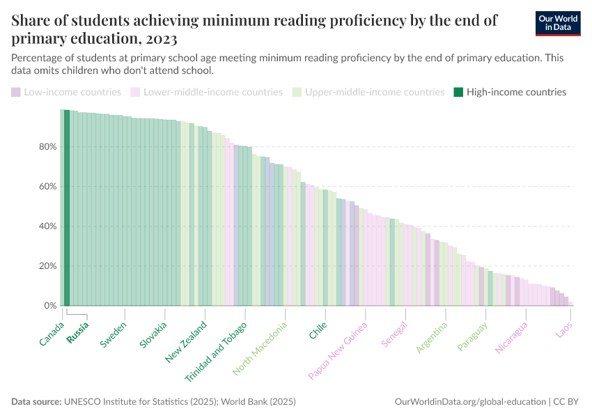 UNESCO Institute for Statistics (2025) – with minor processing by Our World in Data. “Share of students achieving minimum reading proficiency by the end of primary education” [dataset]. UNESCO Institute for Statistics, “UNESCO Institute for Statistics (UIS) - Education” [original data]. Retrieved February 13, 2026 from https://archive.ourworldindata.org/20260122-091445/grapher/share-of-students-at-end-of-primary-education-achieving-minimum-reading-proficiency.html (archived on January 22, 2026).