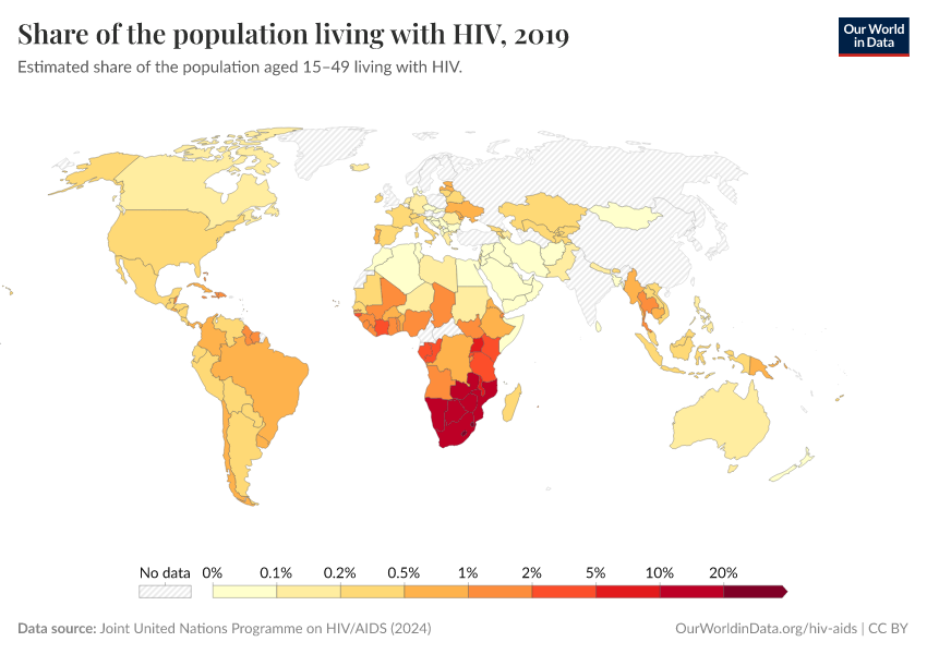 Joint United Nations Programme on HIV/AIDS (2024) – with minor processing by Our World in Data. “Share of the population living with HIV – aged 15-49, central estimate” [dataset]. Joint United Nations Programme on HIV/AIDS, “Global AIDS Update” [original data]. Retrieved December 8, 2025 from https://archive.ourworldindata.org/20250909-093708/grapher/share-of-the-population-infected-with-hiv.html (archived on September 9, 2025).