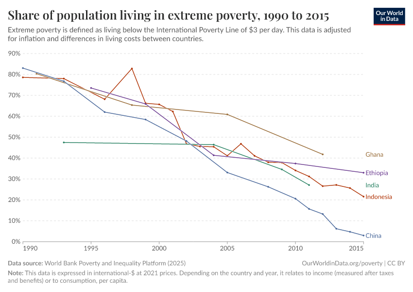 World Bank Poverty and Inequality Platform (2025) – with major processing by Our World in Data. “Share of population living in extreme poverty – World Bank” [dataset]. World Bank Poverty and Inequality Platform, “World Bank Poverty and Inequality Platform (PIP) 20250930_2021, 20250930_2017” [original data]. Retrieved December 9, 2025 from https://archive.ourworldindata.org/20251030-150046/grapher/share-of-population-in-extreme-poverty.html (archived on October 30, 2025).