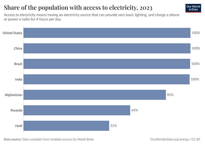 “Data Page: Share of the population with access to electricity”, part of the following publication: Hannah Ritchie, Pablo Rosado, and Max Roser (2019) - “Access to Energy”. Data adapted from SDG 7.1.1 Electrification Dataset, World Bank, via World Bank. Retrieved from https://archive.ourworldindata.org/20260304-094028/grapher/share-of-the-population-with-access-to-electricity.html [online resource] (archived on March 4, 2026).How to cite this data