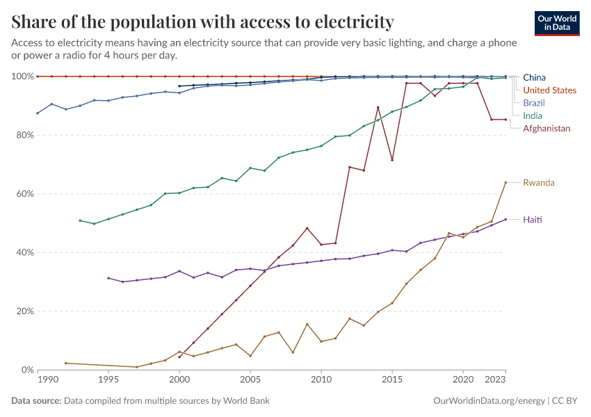 “Data Page: Share of the population with access to electricity”, part of the following publication: Hannah Ritchie, Pablo Rosado, and Max Roser (2019) - “Access to Energy”. Data adapted from SDG 7.1.1 Electrification Dataset, World Bank, via World Bank. Retrieved from https://archive.ourworldindata.org/20260202-181317/grapher/share-of-the-population-with-access-to-electricity.html [online resource] (archived on February 2, 2026).How to cite this data