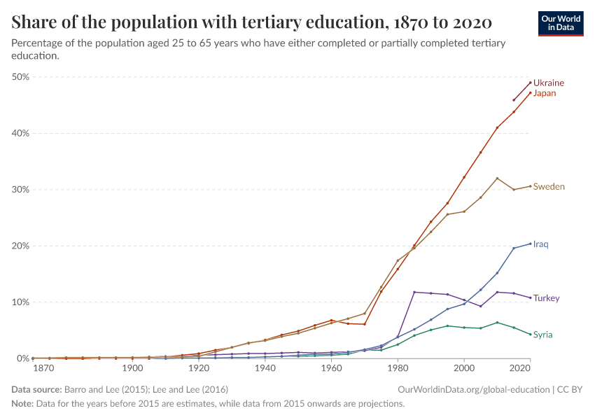 Barro and Lee (2015); Lee and Lee (2016) – with major processing by Our World in Data. “Share of the population with tertiary education” [dataset]. Barro and Lee, “Projections of Educational Attainment”; Lee and Lee, “Human Capital in the Long Run” [original data]. Retrieved December 10, 2025 from https://archive.ourworldindata.org/20250909-093708/grapher/share-of-the-population-with-completed-tertiary-education.html (archived on September 9, 2025).