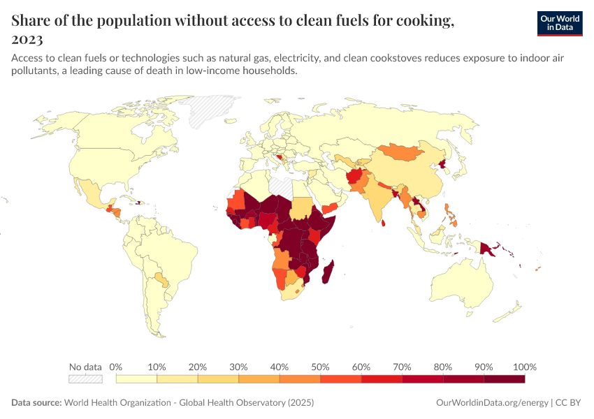 World Health Organization - Global Health Observatory (2025) – processed by Our World in Data. “Share of the population without access to clean fuels for cooking” [dataset]. World Health Organization, “Global Health Observatory” [original data]. Retrieved January 16, 2026 from https://archive.ourworldindata.org/20250909-093708/grapher/share-of-the-population-without-access-to-clean-fuels-for-cooking.html (archived on September 9, 2025).