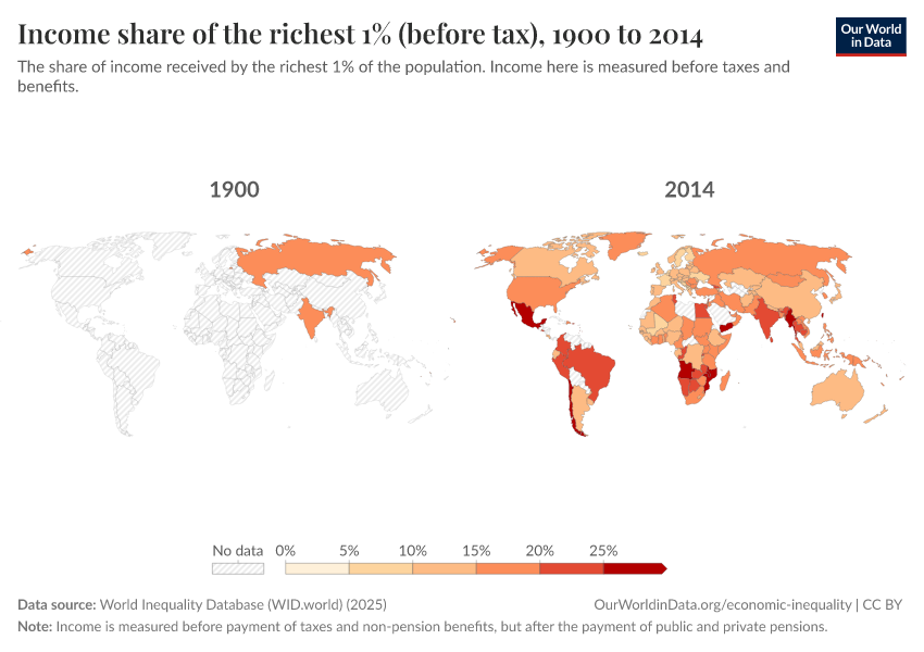 “Data Page: Income share of the richest 1% (before tax)”, part of the following publication: Joe Hasell, Bertha Rohenkohl, Pablo Arriagada, Esteban Ortiz-Ospina, and Max Roser (2023) - “Economic Inequality”. Data adapted from World Inequality Database (WID.world). Retrieved from https://archive.ourworldindata.org/20260120-193133/grapher/income-share-top-1-before-tax-wid.html [online resource] (archived on January 20, 2026).How to cite this data