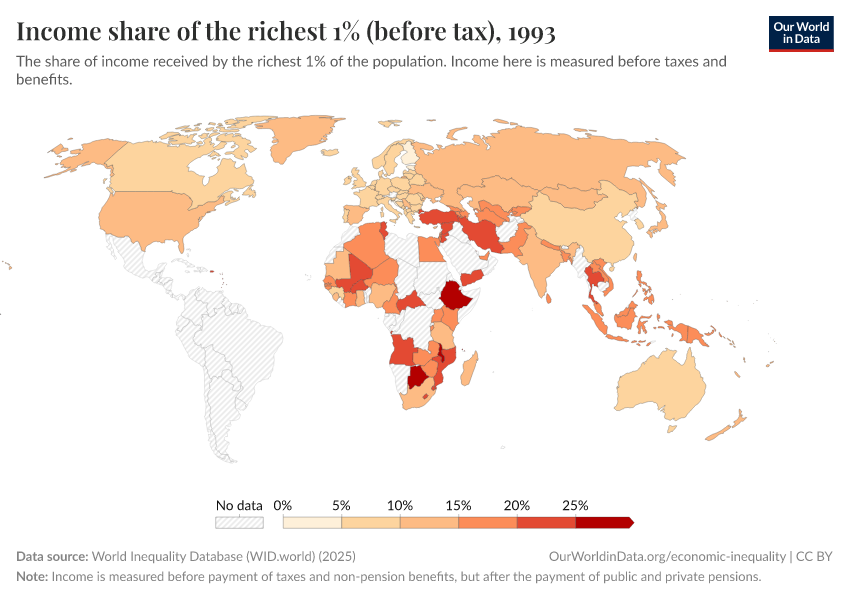 World Inequality Database (WID.world) (2025) – with major processing by Our World in Data. “Income share of the richest 1% (before tax) – World Inequality Database – Before tax” [dataset]. World Inequality Database (WID.world), “World Inequality Database (WID)” [original data]. Retrieved December 8, 2025 from https://archive.ourworldindata.org/20250909-093708/grapher/income-share-top-1-before-tax-wid.html (archived on September 9, 2025).