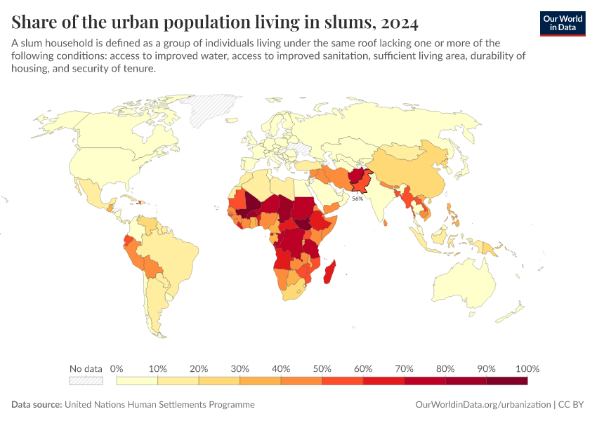 United Nations Human Settlements Programme – processed by Our World in Data. “Share of the urban population living in slums” [dataset]. United Nations Human Settlements Programme, “Data from multiple sources” [original data]. Retrieved February 9, 2026 from https://archive.ourworldindata.org/20260130-180113/grapher/share-of-urban-population-living-in-slums.html (archived on January 30, 2026).