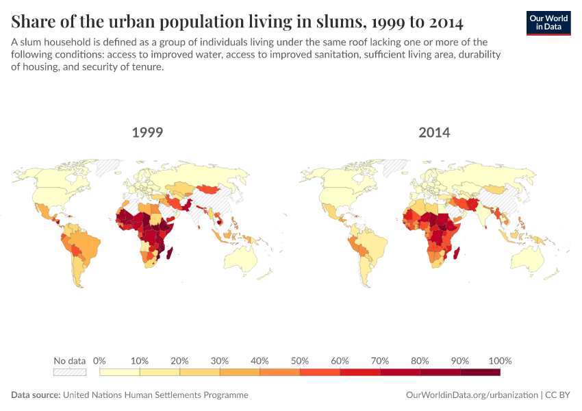 “Data Page: Share of the urban population living in slums”. Our World in Data (2026). Data adapted from United Nations Human Settlements Programme. Retrieved from https://archive.ourworldindata.org/20251125-165536/grapher/share-of-urban-population-living-in-slums.html [online resource] (archived on November 25, 2025).How to cite this data