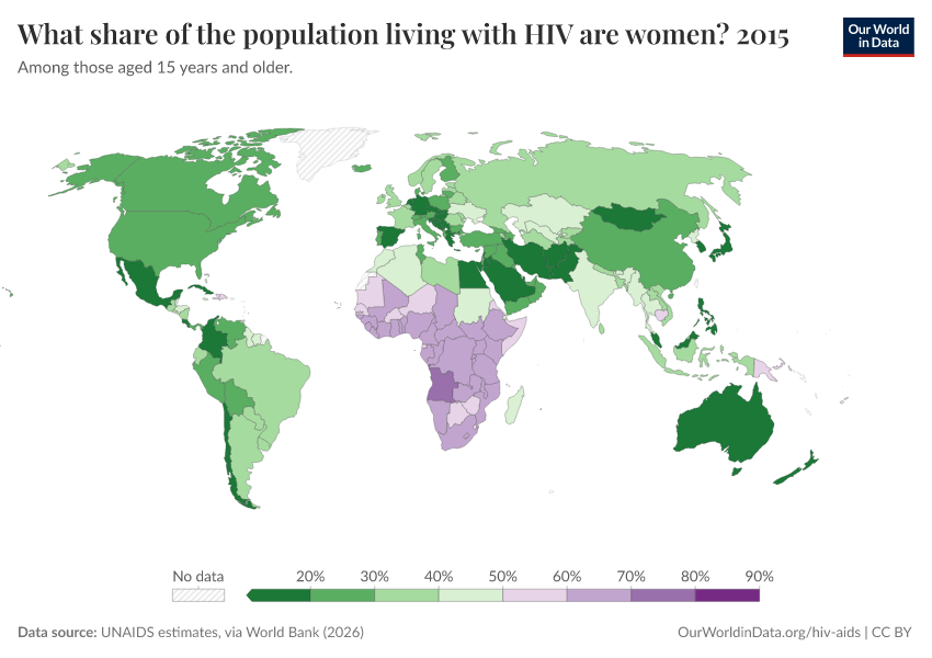“Data Page: What share of the population living with HIV are women?”. Our World in Data (2026). Data adapted from UNAIDS estimates, via World Bank. Retrieved from https://archive.ourworldindata.org/20260202-181317/grapher/share-of-women-among-the-population-living-with-hiv.html [online resource] (archived on February 2, 2026).
