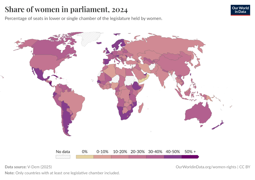 “Data Page: Share of women in parliament”, part of the following publication: Bastian Herre, Lucas Rodés-Guirao, and Esteban Ortiz-Ospina (2013) - “Democracy”. Data adapted from V-Dem. Retrieved from https://archive.ourworldindata.org/20250925-233948/grapher/share-of-women-in-parliament.html [online resource] (archived on September 25, 2025).How to cite this data