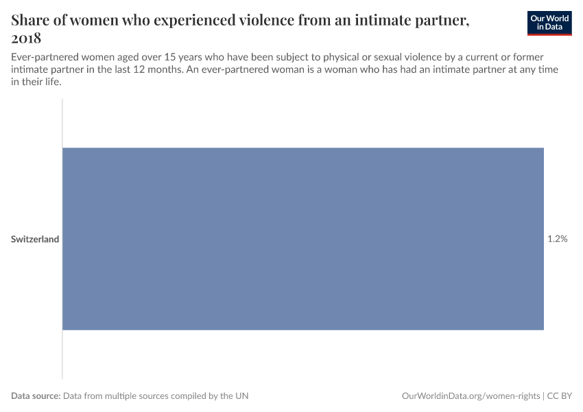 “Data Page: Share of women who experienced violence from an intimate partner”. Our World in Data (2026). Data adapted from Data from multiple sources compiled by the UN. Retrieved from https://archive.ourworldindata.org/20251209-133038/grapher/share-of-women-who-experienced-violence-by-an-intimate-partner-un.html [online resource] (archived on December 9, 2025).How to cite this data