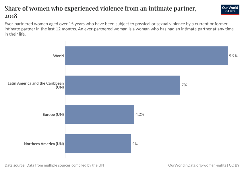“Data Page: Share of women who experienced violence from an intimate partner”. Our World in Data (2025). Data adapted from Data from multiple sources compiled by the UN. Retrieved from https://archive.ourworldindata.org/20251209-133038/grapher/share-of-women-who-experienced-violence-by-an-intimate-partner-un.html [online resource] (archived on December 9, 2025).How to cite this data