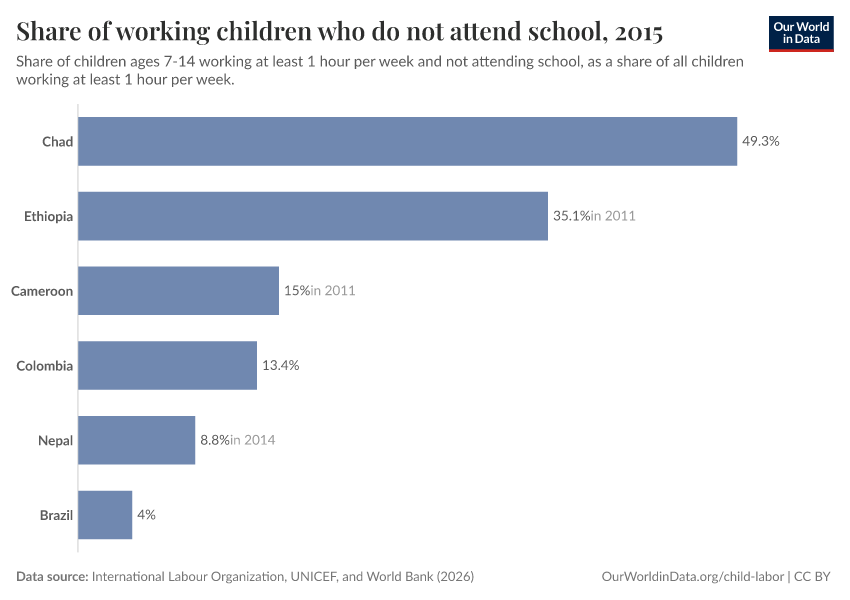 “Data Page: Share of working children who do not attend school”, part of the following publication: Bertha Rohenkohl, Pablo Arriagada, and Esteban Ortiz-Ospina (2026) - “Work and Employment”. Data adapted from International Labour Organization, UNICEF, and World Bank. Retrieved from https://archive.ourworldindata.org/20260301-082651/grapher/share-of-working-children-who-work-only.html [online resource] (archived on March 1, 2026).How to cite this data