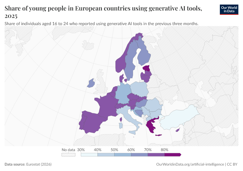Eurostat (2026) – with minor processing by Our World in Data. “Share of young people in European countries using generative AI tools” [dataset]. Eurostat, “Use of generative AI tools by individuals” [original data]. Retrieved April 20, 2026 from https://archive.ourworldindata.org/20260420-160145/grapher/share-of-young-people-in-european-countries-using-generative-ai-tools.html (archived on April 20, 2026).Download