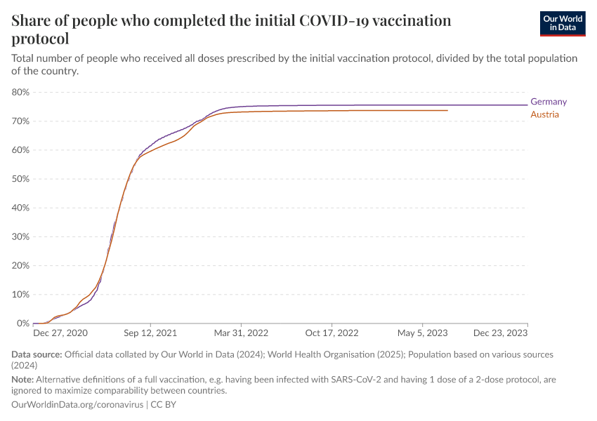Official data collated by Our World in Data (2024); World Health Organisation (2025); Population based on various sources (2024) – with major processing by Our World in Data. “Share of people who completed the initial COVID-19 vaccination protocol” [dataset]. Official data collated by Our World in Data, “COVID-19, vaccinations”; World Health Organisation, “COVID-19, vaccinations (WHO)”; Various sources, “Population” [original data]. Retrieved January 21, 2026 from https://archive.ourworldindata.org/20260119-065148/grapher/share-people-fully-vaccinated-covid.html (archived on January 19, 2026).