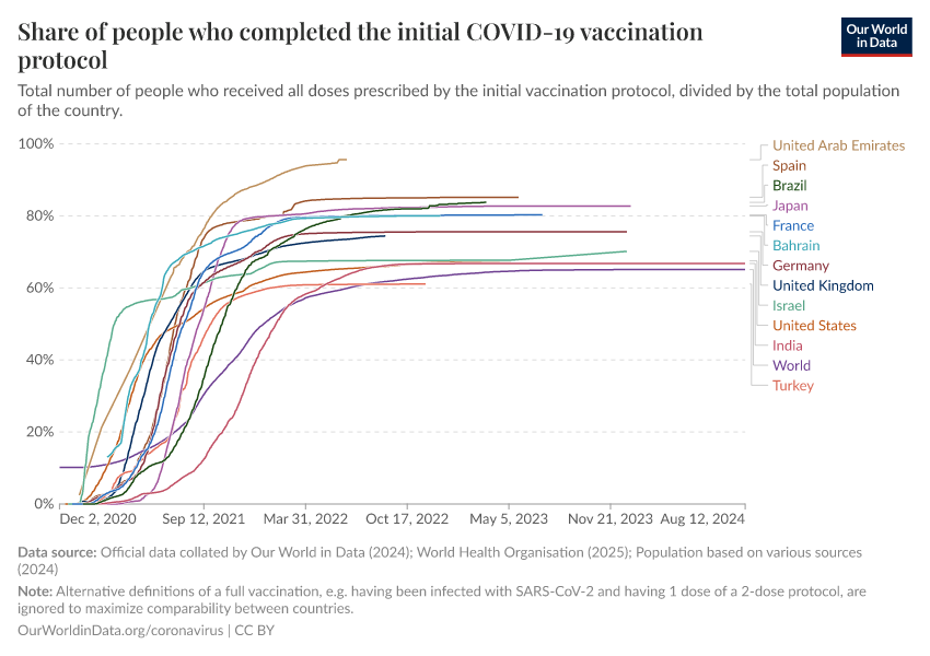 Official data collated by Our World in Data (2024); World Health Organisation (2025); Population based on various sources (2024) – with major processing by Our World in Data. “Share of people who completed the initial COVID-19 vaccination protocol” [dataset]. Official data collated by Our World in Data, “COVID-19, vaccinations”; World Health Organisation, “COVID-19, vaccinations (WHO)”; Various sources, “Population” [original data]. Retrieved December 13, 2025 from https://archive.ourworldindata.org/20250925-233948/grapher/share-people-fully-vaccinated-covid.html (archived on September 25, 2025).
