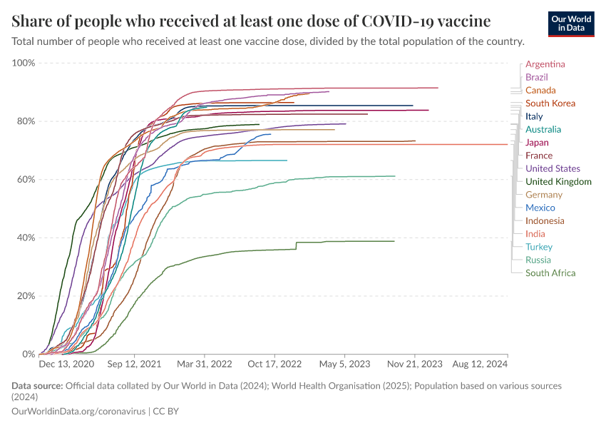 “Data Page: Share of people who received at least one dose of COVID-19 vaccine”, part of the following publication: Edouard Mathieu, Hannah Ritchie, Lucas Rodés-Guirao, Cameron Appel, Daniel Gavrilov, Charlie Giattino, Joe Hasell, Bobbie Macdonald, Saloni Dattani, Diana Beltekian, Esteban Ortiz-Ospina, and Max Roser (2020) - “COVID-19 Pandemic”. Data adapted from Official data collated by Our World in Data, World Health Organisation, Various sources. Retrieved from https://archive.ourworldindata.org/20250925-233948/grapher/share-people-vaccinated-covid.html [online resource] (archived on September 25, 2025).How to cite this data