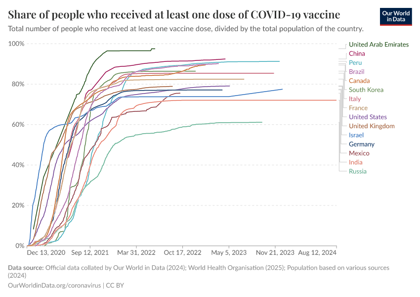 “Data Page: Share of people who received at least one dose of COVID-19 vaccine”, part of the following publication: Edouard Mathieu, Hannah Ritchie, Lucas Rodés-Guirao, Cameron Appel, Daniel Gavrilov, Charlie Giattino, Joe Hasell, Bobbie Macdonald, Saloni Dattani, Diana Beltekian, Esteban Ortiz-Ospina, and Max Roser (2020) - “COVID-19 Pandemic”. Data adapted from Official data collated by Our World in Data, World Health Organisation, Various sources. Retrieved from https://archive.ourworldindata.org/20250925-233948/grapher/share-people-vaccinated-covid.html [online resource] (archived on September 25, 2025).How to cite this data