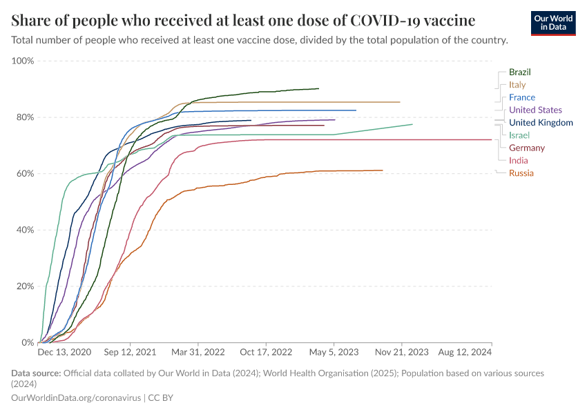 “Data Page: Share of people who received at least one dose of COVID-19 vaccine”, part of the following publication: Edouard Mathieu, Hannah Ritchie, Lucas Rodés-Guirao, Cameron Appel, Daniel Gavrilov, Charlie Giattino, Joe Hasell, Bobbie Macdonald, Saloni Dattani, Diana Beltekian, Esteban Ortiz-Ospina, and Max Roser (2020) - “COVID-19 Pandemic”. Data adapted from Official data collated by Our World in Data, World Health Organisation, Various sources. Retrieved from https://archive.ourworldindata.org/20250925-233948/grapher/share-people-vaccinated-covid.html [online resource] (archived on September 25, 2025).How to cite this data
