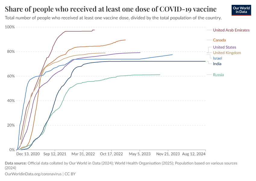 “Data Page: Share of people who received at least one dose of COVID-19 vaccine”, part of the following publication: Edouard Mathieu, Hannah Ritchie, Lucas Rodés-Guirao, Cameron Appel, Daniel Gavrilov, Charlie Giattino, Joe Hasell, Bobbie Macdonald, Saloni Dattani, Diana Beltekian, Esteban Ortiz-Ospina, and Max Roser (2020) - “COVID-19 Pandemic”. Data adapted from Official data collated by Our World in Data, World Health Organisation, Various sources. Retrieved from https://archive.ourworldindata.org/20260119-065148/grapher/share-people-vaccinated-covid.html [online resource] (archived on January 19, 2026).How to cite this data