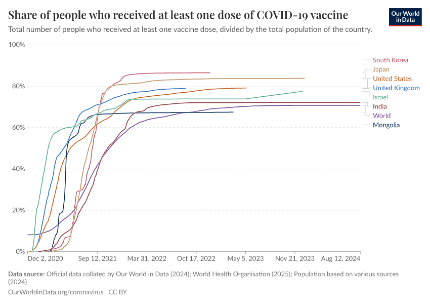 “Data Page: Share of people who received at least one dose of COVID-19 vaccine”, part of the following publication: Edouard Mathieu, Hannah Ritchie, Lucas Rodés-Guirao, Cameron Appel, Daniel Gavrilov, Charlie Giattino, Joe Hasell, Bobbie Macdonald, Saloni Dattani, Diana Beltekian, Esteban Ortiz-Ospina, and Max Roser (2020) - “COVID-19 Pandemic”. Data adapted from Official data collated by Our World in Data, World Health Organisation, Various sources. Retrieved from https://archive.ourworldindata.org/20250925-233948/grapher/share-people-vaccinated-covid.html [online resource] (archived on September 25, 2025).How to cite this data