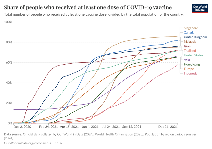 “Data Page: Share of people who received at least one dose of COVID-19 vaccine”, part of the following publication: Edouard Mathieu, Hannah Ritchie, Lucas Rodés-Guirao, Cameron Appel, Daniel Gavrilov, Charlie Giattino, Joe Hasell, Bobbie Macdonald, Saloni Dattani, Diana Beltekian, Esteban Ortiz-Ospina, and Max Roser (2020) - “COVID-19 Pandemic”. Data adapted from Official data collated by Our World in Data, World Health Organisation, Various sources. Retrieved from https://archive.ourworldindata.org/20250925-233948/grapher/share-people-vaccinated-covid.html [online resource] (archived on September 25, 2025).How to cite this data