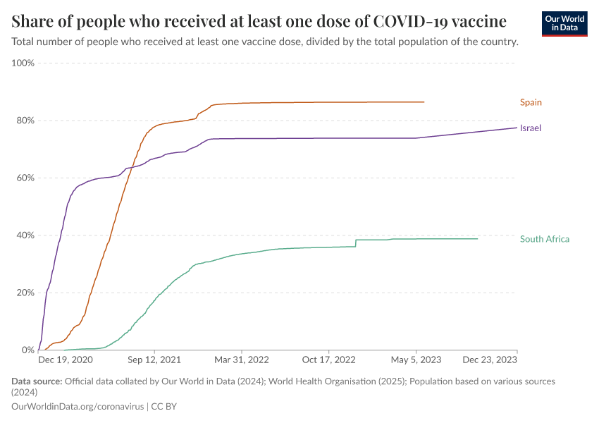 Official data collated by Our World in Data (2024); World Health Organisation (2025); Population based on various sources (2024) – with major processing by Our World in Data. “Share of people who received at least one dose of COVID-19 vaccine” [dataset]. Official data collated by Our World in Data, “COVID-19, vaccinations”; World Health Organisation, “COVID-19, vaccinations (WHO)”; Various sources, “Population” [original data]. Retrieved April 5, 2026 from https://archive.ourworldindata.org/20260402-164039/grapher/share-people-vaccinated-covid.html (archived on April 2, 2026).Download