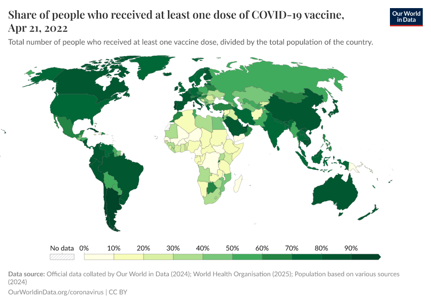 “Data Page: Share of people who received at least one dose of COVID-19 vaccine”, part of the following publication: Edouard Mathieu, Hannah Ritchie, Lucas Rodés-Guirao, Cameron Appel, Daniel Gavrilov, Charlie Giattino, Joe Hasell, Bobbie Macdonald, Saloni Dattani, Diana Beltekian, Esteban Ortiz-Ospina, and Max Roser (2020) - “COVID-19 Pandemic”. Data adapted from Official data collated by Our World in Data, World Health Organisation, Various sources. Retrieved from https://archive.ourworldindata.org/20250925-233948/grapher/share-people-vaccinated-covid.html [online resource] (archived on September 25, 2025).How to cite this data