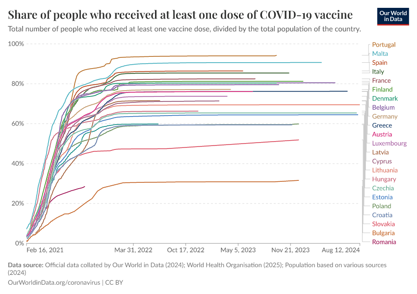 “Data Page: Share of people who received at least one dose of COVID-19 vaccine”, part of the following publication: Edouard Mathieu, Hannah Ritchie, Lucas Rodés-Guirao, Cameron Appel, Daniel Gavrilov, Charlie Giattino, Joe Hasell, Bobbie Macdonald, Saloni Dattani, Diana Beltekian, Esteban Ortiz-Ospina, and Max Roser (2020) - “COVID-19 Pandemic”. Data adapted from Official data collated by Our World in Data, World Health Organisation, Various sources. Retrieved from https://archive.ourworldindata.org/20250925-233948/grapher/share-people-vaccinated-covid.html [online resource] (archived on September 25, 2025).How to cite this data