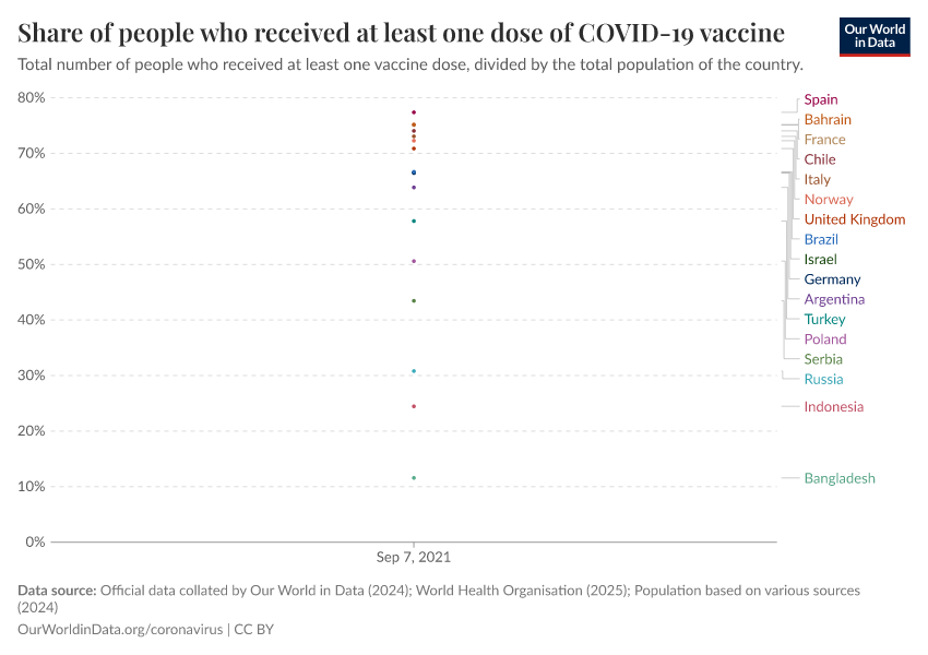 “Data Page: Share of people who received at least one dose of COVID-19 vaccine”, part of the following publication: Edouard Mathieu, Hannah Ritchie, Lucas Rodés-Guirao, Cameron Appel, Daniel Gavrilov, Charlie Giattino, Joe Hasell, Bobbie Macdonald, Saloni Dattani, Diana Beltekian, Esteban Ortiz-Ospina, and Max Roser (2020) - “COVID-19 Pandemic”. Data adapted from Official data collated by Our World in Data, World Health Organisation, Various sources. Retrieved from https://archive.ourworldindata.org/20260119-065148/grapher/share-people-vaccinated-covid.html [online resource] (archived on January 19, 2026).How to cite this data