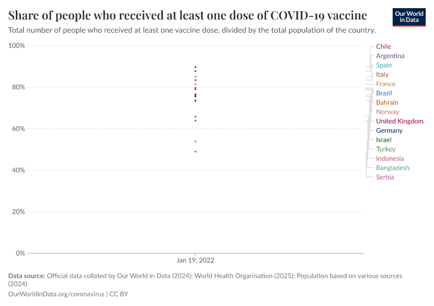“Data Page: Share of people who received at least one dose of COVID-19 vaccine”, part of the following publication: Edouard Mathieu, Hannah Ritchie, Lucas Rodés-Guirao, Cameron Appel, Daniel Gavrilov, Charlie Giattino, Joe Hasell, Bobbie Macdonald, Saloni Dattani, Diana Beltekian, Esteban Ortiz-Ospina, and Max Roser (2020) - “COVID-19 Pandemic”. Data adapted from Official data collated by Our World in Data, World Health Organisation, Various sources. Retrieved from https://archive.ourworldindata.org/20260119-065148/grapher/share-people-vaccinated-covid.html [online resource] (archived on January 19, 2026).How to cite this data