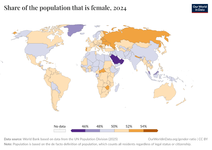 “Data Page: Share of the population that is female”. Our World in Data (2025). Data adapted from World Bank based on data from the UN Population Division. Retrieved from https://archive.ourworldindata.org/20250916-102301/grapher/share-population-female.html [online resource] (archived on September 16, 2025).How to cite this data