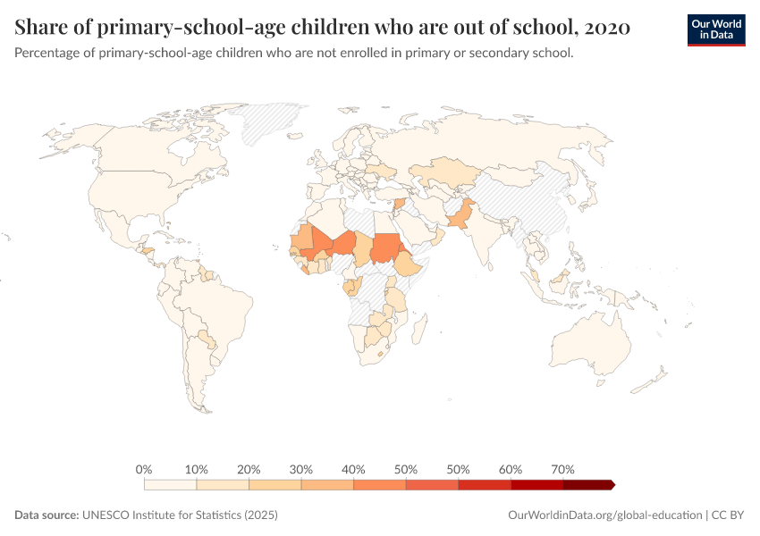 UNESCO Institute for Statistics (2025) – with minor processing by Our World in Data. “Out-of-school rate for children of primary school age” [dataset]. UNESCO Institute for Statistics, “UNESCO Institute for Statistics (UIS) - Education” [original data]. Retrieved January 13, 2026 from https://archive.ourworldindata.org/20250909-093708/grapher/share-primary-school-age-out-of-school.html (archived on September 9, 2025).