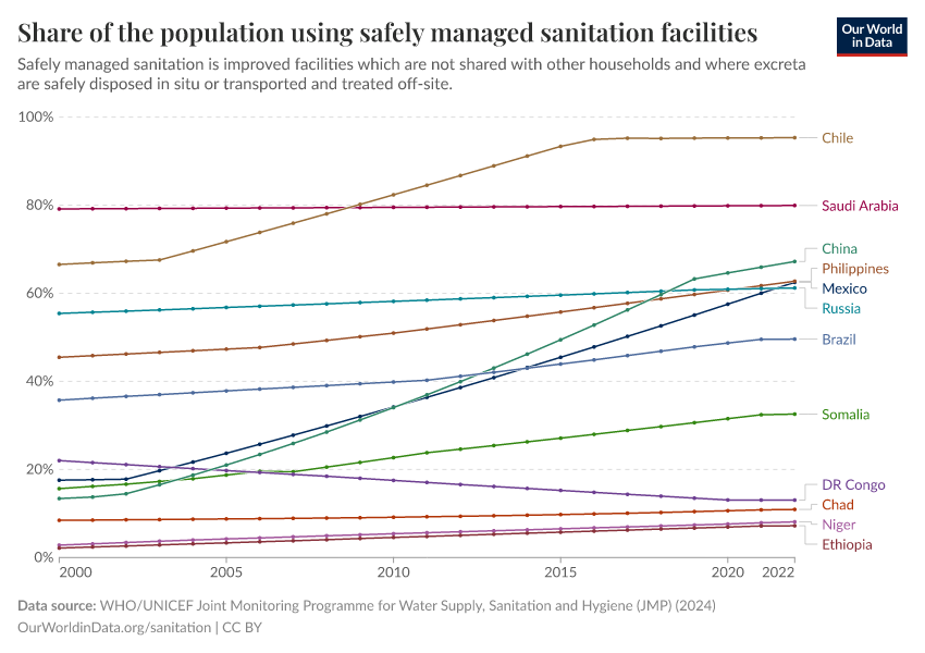 WHO/UNICEF Joint Monitoring Programme for Water Supply, Sanitation and Hygiene (JMP) (2024) – with major processing by Our World in Data. “Share of the population using safely managed sanitation facilities” [dataset]. WHO/UNICEF Joint Monitoring Programme for Water Supply, Sanitation and Hygiene (JMP), “WHO/UNICEF Joint Monitoring Programme for Water Supply, Sanitation and  Hygiene (JMP) - Households”; WHO/UNICEF Joint Monitoring Programme for Water Supply, Sanitation and Hygiene (JMP), “WHO/UNICEF Joint Monitoring Programme for Water Supply, Sanitation and  Hygiene (JMP) - Households - Regions” [original data]. Retrieved December 31, 2025 from https://archive.ourworldindata.org/20250909-093708/grapher/share-using-safely-managed-sanitation.html (archived on September 9, 2025).