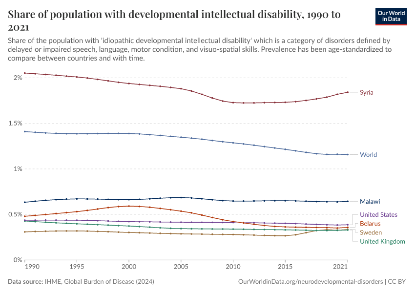 IHME, Global Burden of Disease (2024) – with major processing by Our World in Data. “Share of population with developmental intellectual disability” [dataset]. IHME, Global Burden of Disease, “Global Burden of Disease - Mental Health Prevalence” [original data]. Retrieved January 11, 2026 from https://archive.ourworldindata.org/20250909-093708/grapher/share-with-idiopathic-developmental-intellectual-disability.html (archived on September 9, 2025).