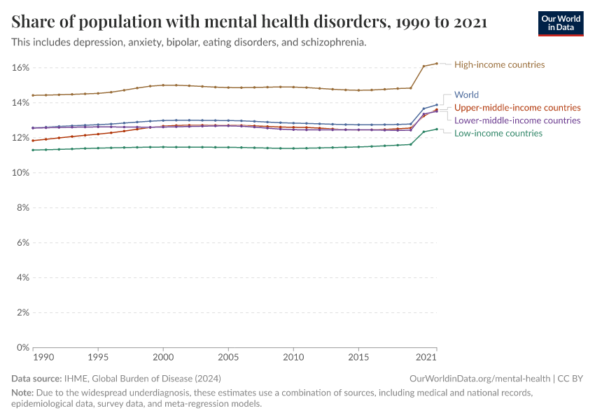 IHME, Global Burden of Disease (2024) – with major processing by Our World in Data. “Share of population with mental health disorders” [dataset]. IHME, Global Burden of Disease, “Global Burden of Disease - Prevalence and Incidence” [original data]. Retrieved December 7, 2025 from https://archive.ourworldindata.org/20250909-093708/grapher/share-with-mental-and-substance-disorders.html (archived on September 9, 2025).