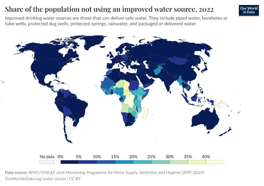 “Data Page: Share of the population not using an improved water source”, part of the following publication: Hannah Ritchie, Fiona Spooner, and Max Roser (2021) - “Clean Water and Sanitation”. Data adapted from WHO/UNICEF Joint Monitoring Programme for Water Supply, Sanitation and Hygiene (JMP). Retrieved from https://archive.ourworldindata.org/20250909-093708/grapher/share-without-improved-water.html [online resource] (archived on September 9, 2025).