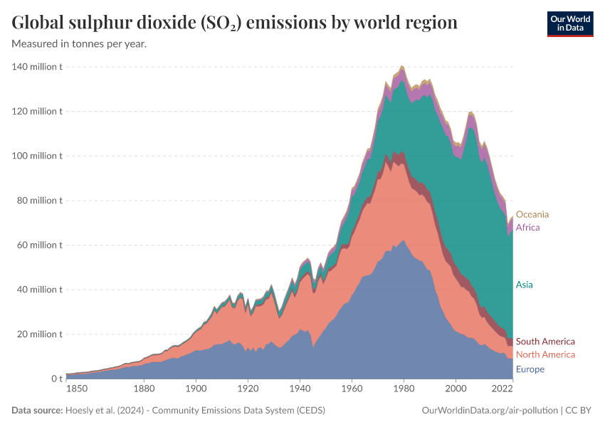 Hoesly et al. (2024) - Community Emissions Data System (CEDS) – with major processing by Our World in Data. “Sulfur dioxide emissions from all sectors” [dataset]. Hoesly et al., “Community Emissions Data System v_2024_07_08” [original data]. Retrieved February 21, 2026 from https://archive.ourworldindata.org/20260116-143329/grapher/so-emissions-by-world-region-in-million-tonnes.html (archived on January 16, 2026).