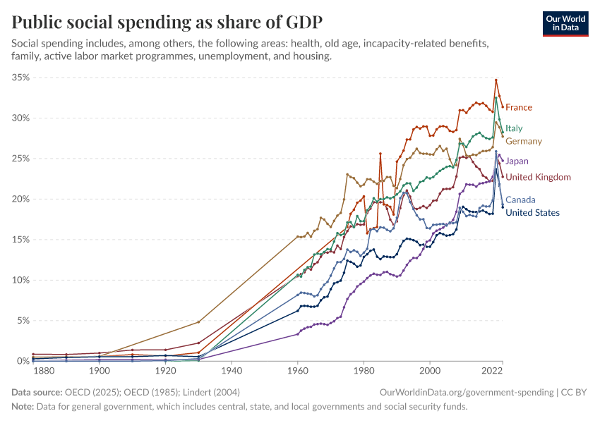 OECD (2025); OECD (1985); Lindert (2004) – with major processing by Our World in Data. “Public social expenditure as a share of GDP – Lindert, OECD – Historical data” [dataset]. OECD, “OECD Social Expenditure Database (SOCX)”; OECD, “Social Expenditure 1960-1990: Problems of Growth and Control”; Lindert, “Growing Public: Social Spending and Economic Growth since the Eighteenth Century” [original data]. Retrieved December 20, 2025 from https://archive.ourworldindata.org/20251211-184053/grapher/social-spending-oecd-longrun.html (archived on December 11, 2025).
