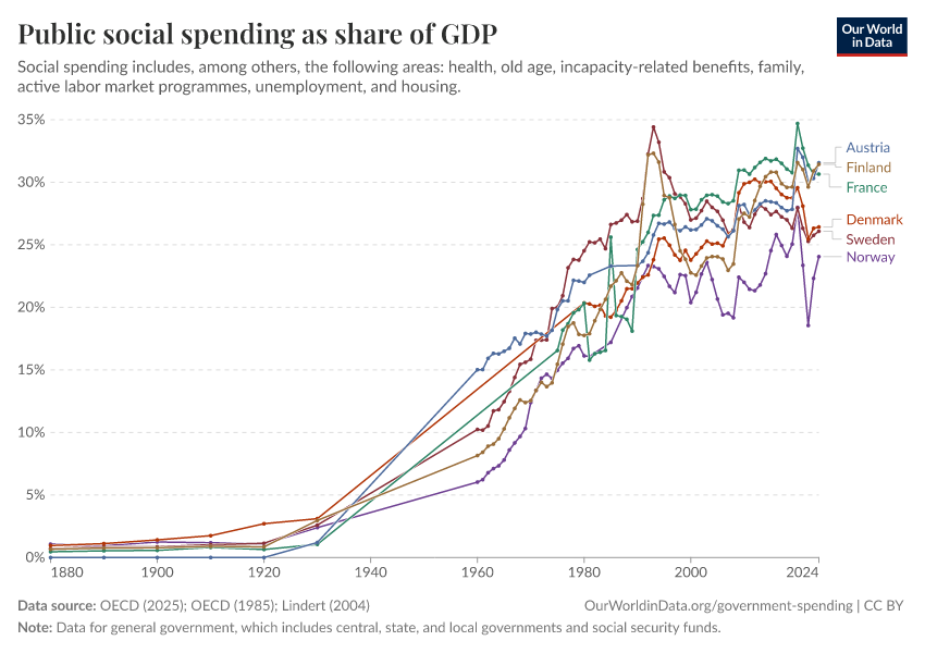 OECD (2025); OECD (1985); Lindert (2004) – with major processing by Our World in Data. “Public social expenditure as a share of GDP – Lindert, OECD – Historical data” [dataset]. OECD, “OECD Social Expenditure Database (SOCX)”; OECD, “Social Expenditure 1960-1990: Problems of Growth and Control”; Lindert, “Growing Public: Social Spending and Economic Growth since the Eighteenth Century” [original data]. Retrieved February 11, 2026 from https://archive.ourworldindata.org/20251211-184053/grapher/social-spending-oecd-longrun.html (archived on December 11, 2025).
