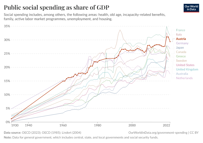 OECD (2023); OECD (1985); Lindert (2004) – with major processing by Our World in Data. “Public social expenditure as a share of GDP – Lindert, OECD – Historical data” [dataset]. OECD, “OECD Social Expenditure Database (SOCX)”; OECD, “Social Expenditure 1960-1990: Problems of Growth and Control”; Lindert, “Growing Public: Social Spending and Economic Growth since the Eighteenth Century” [original data]. Retrieved December 11, 2025 from https://archive.ourworldindata.org/20251126-124233/grapher/social-spending-oecd-longrun.html (archived on November 26, 2025).