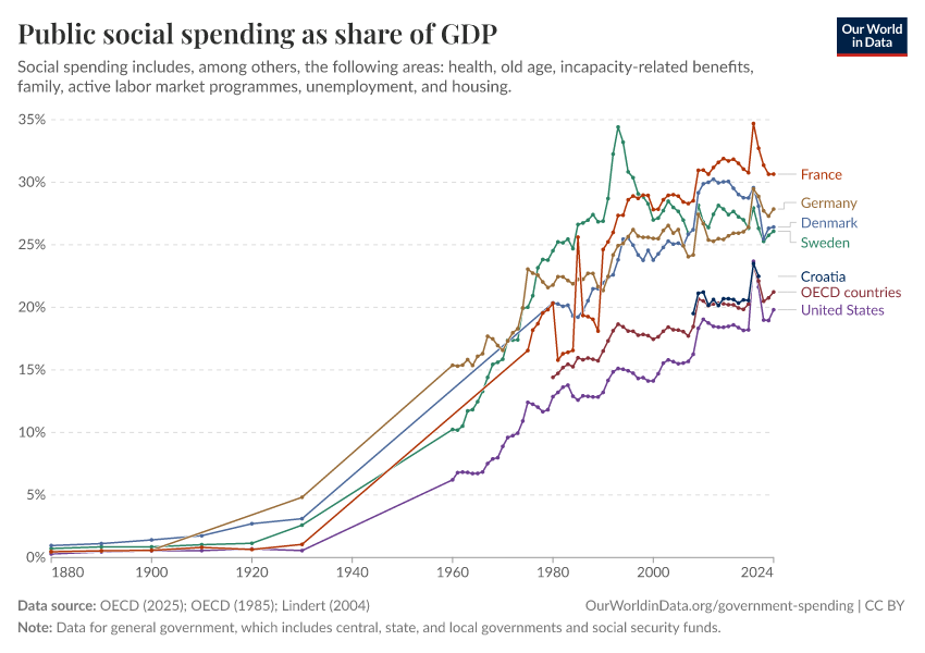 OECD (2025); OECD (1985); Lindert (2004) – with major processing by Our World in Data. “Public social expenditure as a share of GDP – Lindert, OECD – Historical data” [dataset]. OECD, “OECD Social Expenditure Database (SOCX)”; OECD, “Social Expenditure 1960-1990: Problems of Growth and Control”; Lindert, “Growing Public: Social Spending and Economic Growth since the Eighteenth Century” [original data]. Retrieved January 8, 2026 from https://archive.ourworldindata.org/20251211-184053/grapher/social-spending-oecd-longrun.html (archived on December 11, 2025).