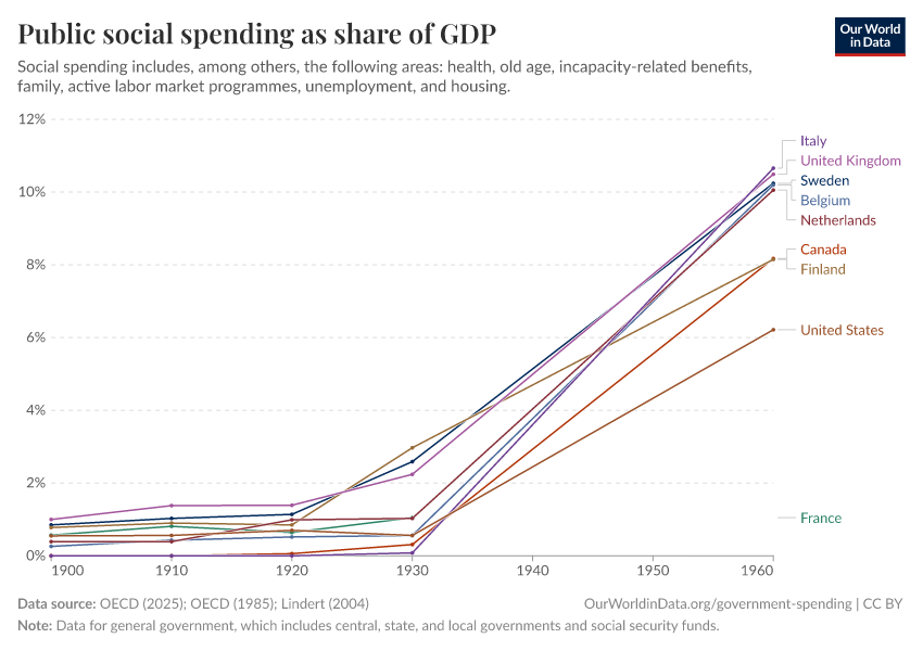 OECD (2025); OECD (1985); Lindert (2004) – with major processing by Our World in Data. “Public social expenditure as a share of GDP – Lindert, OECD – Historical data” [dataset]. OECD, “OECD Social Expenditure Database (SOCX)”; OECD, “Social Expenditure 1960-1990: Problems of Growth and Control”; Lindert, “Growing Public: Social Spending and Economic Growth since the Eighteenth Century” [original data]. Retrieved December 15, 2025 from https://archive.ourworldindata.org/20251211-184053/grapher/social-spending-oecd-longrun.html (archived on December 11, 2025).