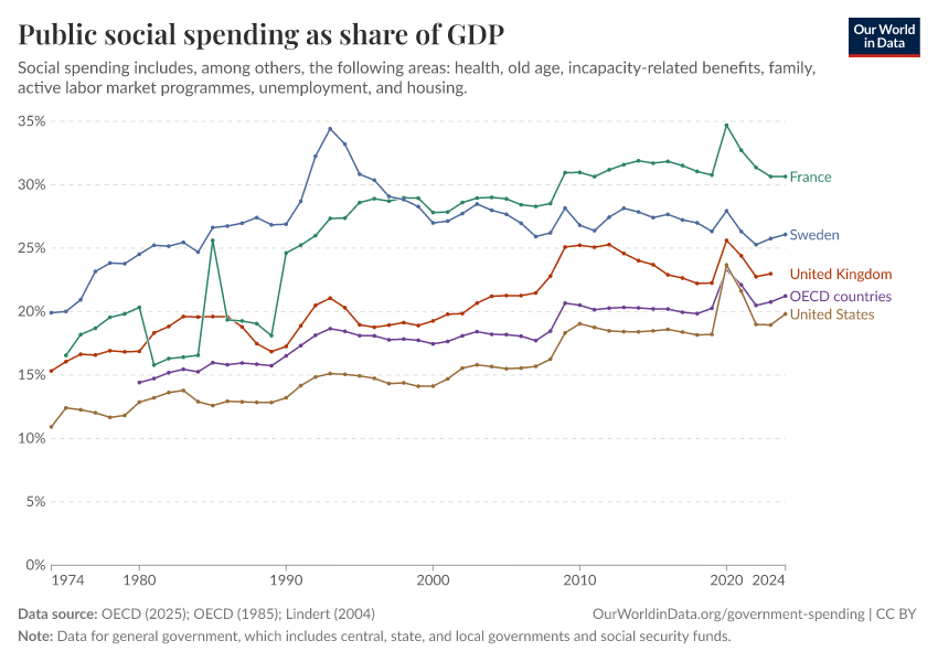 “Data Page: Public social expenditure as a share of GDP”, part of the following publication: Esteban Ortiz-Ospina, Bertha Rohenkohl, Pablo Arriagada, and Max Roser (2016) - “Government Spending”. Data adapted from OECD, Lindert. Retrieved from https://archive.ourworldindata.org/20251211-184053/grapher/social-spending-oecd-longrun.html [online resource] (archived on December 11, 2025).How to cite this data