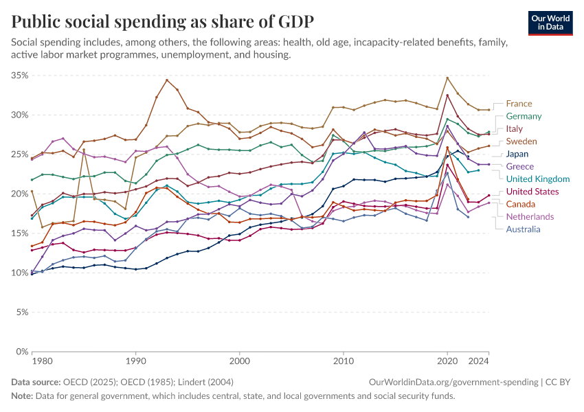 OECD (2025); OECD (1985); Lindert (2004) – with major processing by Our World in Data. “Public social expenditure as a share of GDP – Lindert, OECD – Historical data” [dataset]. OECD, “OECD Social Expenditure Database (SOCX)”; OECD, “Social Expenditure 1960-1990: Problems of Growth and Control”; Lindert, “Growing Public: Social Spending and Economic Growth since the Eighteenth Century” [original data]. Retrieved February 26, 2026 from https://archive.ourworldindata.org/20251211-184053/grapher/social-spending-oecd-longrun.html (archived on December 11, 2025).