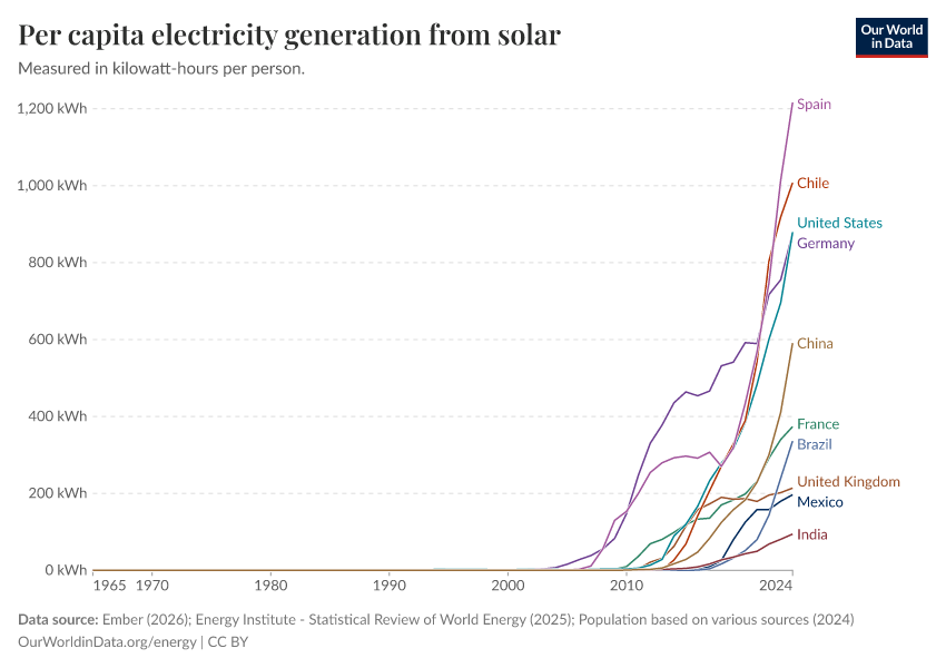 “Data Page: Electricity generation from solar power per person”, part of the following publication: Hannah Ritchie, Pablo Rosado, and Max Roser (2023) - “Energy”. Data adapted from Ember, Energy Institute, Various sources. Retrieved from https://archive.ourworldindata.org/20260119-070102/grapher/solar-electricity-per-capita.html [online resource] (archived on January 19, 2026).