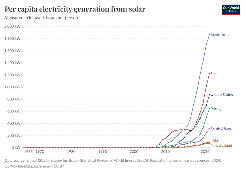 “Data Page: Electricity generation from solar power per person”, part of the following publication: Hannah Ritchie, Pablo Rosado, and Max Roser (2023) - “Energy”. Data adapted from Ember, Energy Institute, Various sources. Retrieved from https://archive.ourworldindata.org/20250925-233948/grapher/solar-electricity-per-capita.html [online resource] (archived on September 25, 2025).How to cite this data
